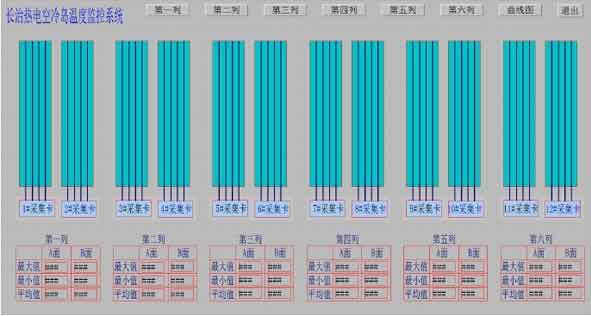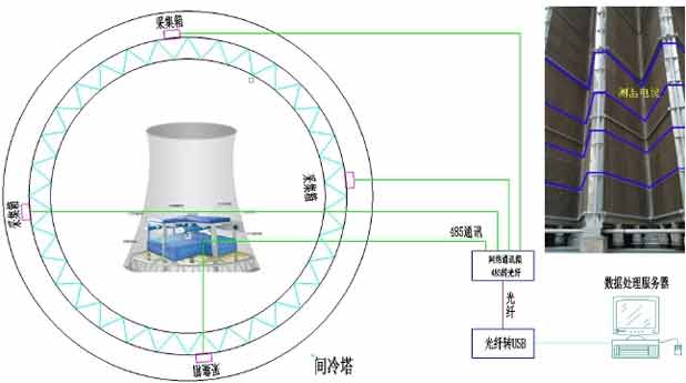 在 A 型散熱塔兩側(cè)垂直高度方向每隔一米布置一根測溫電纜,水平方向每隔 960mm 安置一個測溫點。每一組散熱片安裝一臺溫度采集器,數(shù)據(jù)總線電纜連接所有的采集器,通過 RS485 接口連接至網(wǎng)絡(luò)通訊箱,轉(zhuǎn)成光纖信號通過光纖進(jìn)行遠(yuǎn)距離傳輸至控制室,由數(shù)據(jù)處理服務(wù)器,進(jìn)行處理和顯示。