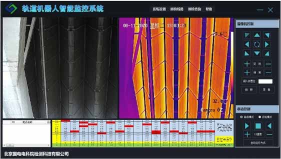 工作界面分三部分,上半部分是軌道機(jī)器人的視頻和熱成像熱的圖像顯示 信息,右側(cè)是軌道機(jī)器人的功能控制?刂品绞椒譃槭謩雍妥詣幽J,點擊可切換。選擇自動模式時,軌道機(jī)器人 按設(shè)置程序運行;選手動模式時,手動控制軌道機(jī)器人的前進(jìn),后退,圖標(biāo)圓綠點為當(dāng)前軌道機(jī)器人所在位置,充電站是始發(fā)站,當(dāng)前進(jìn)時 3號位紅點紅點閃爍,當(dāng)?shù)雇藭r 1 號位紅點閃爍,閃爍頻率位 1hz。