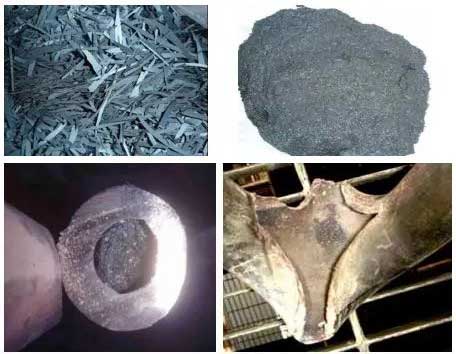 從熱力學(xué)角度來講,鍋爐管內(nèi)壁產(chǎn)生蒸汽氧化現(xiàn)象是必然的,因為鐵與水反應(yīng)生成Fe(OH)2,飽和后在一定溫度范圍轉(zhuǎn)化為Fe3O4在其表面形成Fe3O4氧化膜,并隨同有氫析出。一般來說金屬溫度對氧化速度的影響最大,而蒸汽壓力的影響相對較小,且溫度對于不同鋼種蒸汽氧化速度的影響方向和程度也不盡相同。在長期高溫運(yùn)行過程中,奧氏體不銹鋼過熱器和再熱器管子內(nèi)壁在高溫蒸汽的作用下會不斷氧化而形成連續(xù)的氧化皮,由于氧化皮的膨脹系數(shù) 0.9*10-5?與奧氏體不銹鋼基體金屬的線膨脹系數(shù):2.1*10-5?相比差別很大,溫度變化時二者的熱脹冷縮變形很不協(xié)調(diào)就會引起氧化皮破裂并從金屬表面剝離,因此在機(jī)組啟;驕囟燃眲∽兓瘯r就更易引起管內(nèi)氧化皮大面積剝落堵塞管子。當(dāng)然,不同管子受鍋爐熱偏差影響其內(nèi)壁氧化皮剝落堆積程度也出現(xiàn)較大的差別。據(jù)資料統(tǒng)計分析:亞臨界機(jī)組正常溫度運(yùn)行(541℃),氧化物高峰期應(yīng)在35000小時左右就會出現(xiàn)脫落堵塞管道;國內(nèi)機(jī)組高峰期最早的在 33000小時左右。超臨界機(jī)組正常溫度運(yùn)行(571℃),氧化物高峰期應(yīng)在 15000小時左右就會出現(xiàn)脫落堵塞管道;且溫度越高,高溫氧化就會加速,氧化高峰期來的越早溫度越高,高溫氧化越快,容易造成氧化物運(yùn)行中大面積快速脫落堵塞產(chǎn)生爆管。目前國內(nèi)已有許多機(jī)組相繼出現(xiàn)了鍋爐氧化皮剝落所導(dǎo)致的爆管、汽室部件嚴(yán)重吹損等事故,成為威脅機(jī)組運(yùn)行可靠性的主要因素。其主原因是機(jī)組設(shè)計溫度高,再加上鍋爐受熱面熱偏差,使部分高溫受熱面管子金屬溫度水平偏高, 必然導(dǎo)致高溫受熱面管內(nèi)壁產(chǎn)生蒸汽氧化。生成的管內(nèi)氧化皮(Fe3O4和Fe2O3)在機(jī)組啟;驀娝疁p溫過程中管壁金屬溫度變化所導(dǎo)致的熱應(yīng)力的作用下發(fā)生剝落,在受熱面管下部彎管部位堆積或堵塞管子,造成鍋爐管子過熱損傷,縮短管子的使用壽命或爆管;或被蒸汽帶走造成聯(lián)箱節(jié)流孔堵塞、汽輪機(jī)通流部分吹損。下圖為氧化皮的各種狀態(tài)及堵塞后形成爆管: