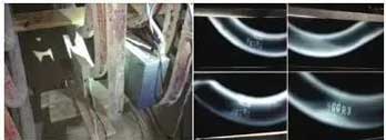 冷陰極數(shù)字射線技術(shù),被曝光量小,透照時間短,不需要訓(xùn)機(jī),冷卻等優(yōu)點;無需外接電源,靠鋰電池便可拍攝上千張X光片;配合DR數(shù)字成像技術(shù),能在幾秒內(nèi)獲取檢測結(jié)果;適用氧化皮檢測儀檢測超標(biāo)后復(fù)檢,確定管內(nèi)氧化皮堆積的具體情況,為是否割管處理提供有效的底片依據(jù)。由于體積小、重量輕、攜帶方便,結(jié)合快速拆裝工裝、移動控制軌道,可快速完成對受限空間的受熱面管全屏底部彎頭氧化皮的檢測。下圖為冷陰極數(shù)字射線及工裝在檢修現(xiàn)場的使用: