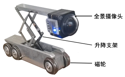 (3) 新研發(fā)的聯(lián)箱視頻機器人可從手孔(大于70mm)進入聯(lián)箱中電動爬行,電動升降支架將高清全景鏡頭置于聯(lián)箱中心線位置。鏡頭視角214度,可清晰顯示周向小孔圖像、小管孔的焊口和節(jié)流圈。檢測效率高,定位準(zhǔn)確,不留死角,檢查一個聯(lián)箱只需不到半小時。行走時磁性吸附,避免重心不穩(wěn)側(cè)翻,且能把鐵磁性異物用磁鐵帶出來。