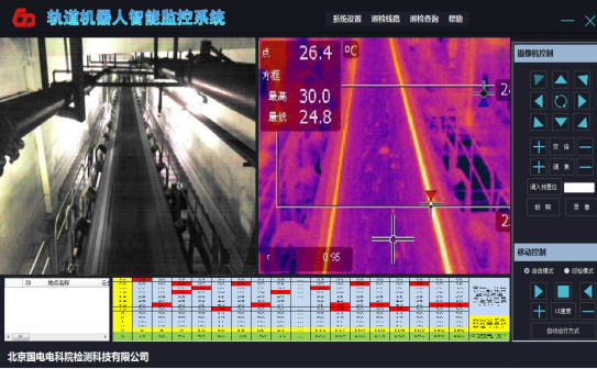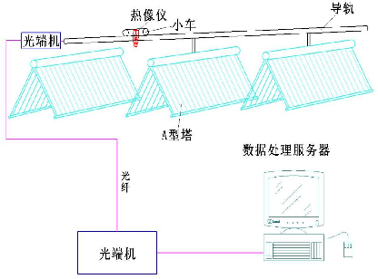 小車每移動到兩組A型塔中間控制熱成像儀或氣水噴頭旋轉(zhuǎn)一周對空冷島散熱器溫度進行采集或清洗,熱成像儀采集的溫度信息通過光纖傳輸?shù)竭h程數(shù)據(jù)服務(wù)器。通過熱紅外分析軟件對實時采集的熱像進行處理、記錄和報警。