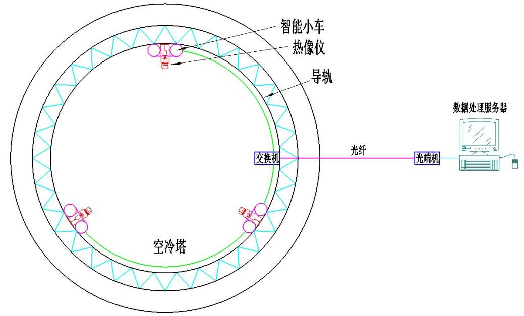 沿空冷塔三角散熱器布置一圈軌道,長度約490米,高度24米,軌道與塔壁用支架支撐固定,軌道平臺系統(tǒng)分三段接入,搭載3套雙光熱成像儀或氣水噴頭。每套小車每行走10米對散熱設(shè)備做垂直掃描運動。分段進行視頻監(jiān)測和散熱器溫度數(shù)據(jù)的采集或臟物清洗,并通過電力載波方式和監(jiān)測中心的數(shù)據(jù)服務(wù)器通訊。每套系統(tǒng)行走長度160米,巡查一次的時間在16分鐘左右。
