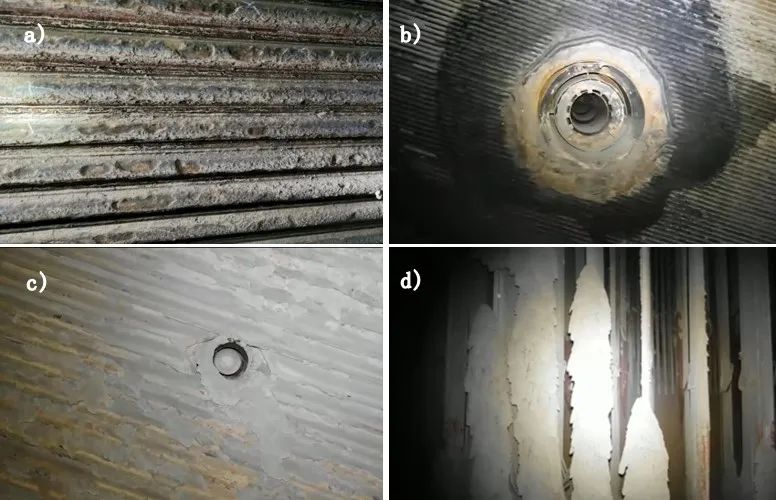c)吹灰器四周水冷壁吹損檢查;d)過(guò)熱器管屏外壁結(jié)焦檢查。