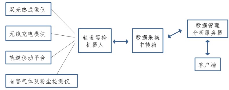 我公司設(shè)計研發(fā)的軌道巡檢機(jī)器人系統(tǒng)主要由機(jī)器人本體、軌道平臺系統(tǒng)、無線充電裝置、數(shù)據(jù)分析服務(wù)器、遠(yuǎn)程控制系統(tǒng)等組成。