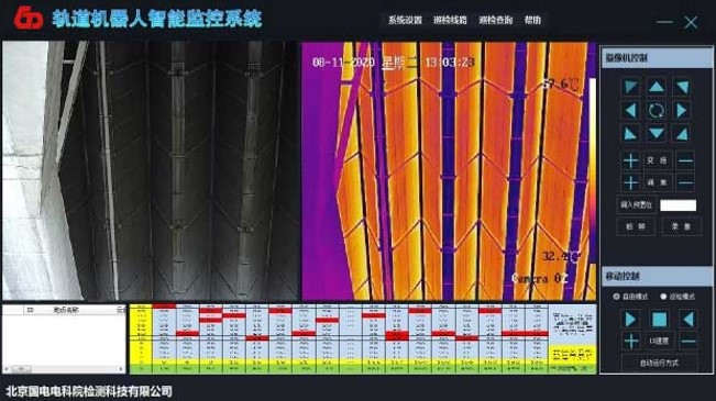 監(jiān)控系統(tǒng)工作界面分三部分,上半部分是軌道機(jī)器人的視頻和熱成像熱的圖像顯示信息,右側(cè)是軌道機(jī)器人的功能控制,下半部分顯示熱成像儀采集的間冷塔散熱器對應(yīng)點溫度數(shù)值。