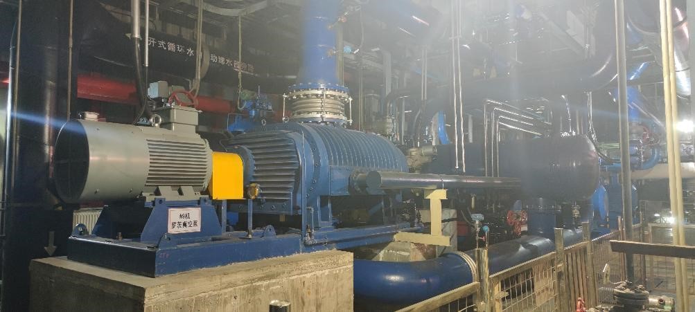 針對以上問題,我們采取極限抽真空能力更強(qiáng)的羅茨真空泵,以提高系統(tǒng)低背壓下的抽真空能力。羅茨真空泵屬于變?nèi)莘e泵,其利用泵腔內(nèi)一對葉形轉(zhuǎn)子同步、反向旋轉(zhuǎn)的推壓作用移動氣體實(shí)現(xiàn)抽氣,較水環(huán)式真空泵而言具有極限抽真空能力強(qiáng)(可達(dá)到0.5kPa以內(nèi))、抽空容量大、節(jié)電等技術(shù)特點(diǎn)。羅茨真空泵作為前級泵,在較寬的壓力范圍內(nèi)有較大抽速,可有效降低抽空氣設(shè)備極限抽吸壓力,一方面提高水環(huán)真空泵入口抽吸壓力,另一方面所抽吸不凝結(jié)氣體在級間換熱器冷卻后進(jìn)入水環(huán)真空泵,增強(qiáng)了水環(huán)真空泵抗汽蝕能力,保證水環(huán)真空泵在高效區(qū)穩(wěn)定運(yùn)行。