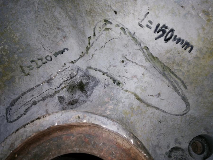 依據(jù)DL/T 438-2016《火力發(fā)電廠金屬監(jiān)督技術(shù)規(guī)程》15.2.1大型鑄件的金屬監(jiān)督規(guī)定:機組每次A級檢修,應(yīng)對受監(jiān)的大型鑄件進行表面檢驗。本次高壓缸缸體檢驗采用了磁粉檢測。檢測標準選用JB/9630.1-1999《汽輪機鑄鋼件磁粉探傷及質(zhì)量分級方法》,檢驗設(shè)備選用CCFS-Ⅱ型交流磁探儀。磁粉檢驗時發(fā)現(xiàn)6處裂紋缺陷,主要分布在缸體變截面部位,裂紋長度分別為:220mm、150mm、120mm、80mm、95mm、30mm。質(zhì)量等級評定為不允許。