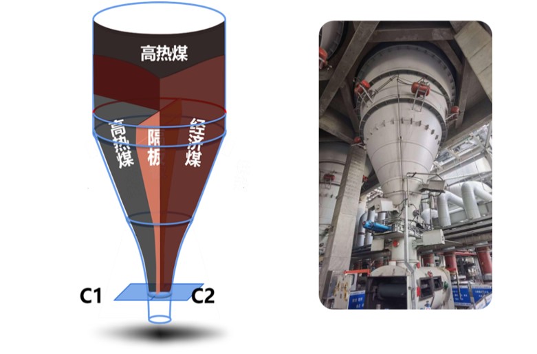 在磨煤機(jī)及給煤機(jī)運(yùn)行中,原煤倉(cāng)隔板的雙向閘板可以任意來回切換,對(duì)原煤倉(cāng)下煤無影響。分隔后的原煤倉(cāng),一半裝好煤,一半裝劣質(zhì)煤,根據(jù)不同負(fù)荷和深度調(diào)峰的需要,自動(dòng)開啟不同的插板門向給煤機(jī)實(shí)時(shí)提供與負(fù)荷相對(duì)應(yīng)的原煤,高負(fù)荷燒高熱值煤,低負(fù)荷燒低熱值煤,滿足快速響應(yīng)負(fù)荷要求的同時(shí)提高了劣質(zhì)煤摻煤率。