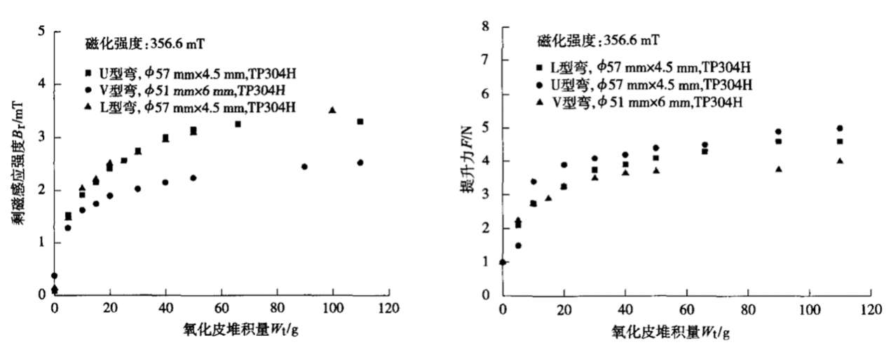 The relationship between remanent magnetic induction intensity and lifting force and the amount of oxide deposition