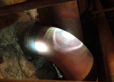 v?結(jié)構(gòu)設(shè)計(jì)不合理----導(dǎo)管的彎頭直接與聯(lián)箱的三通焊接,三通和彎頭之間沒有過渡直管段,造成結(jié)構(gòu)應(yīng)力大